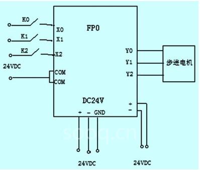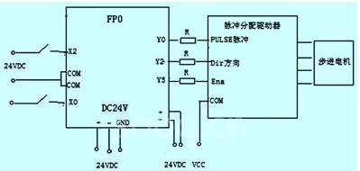 用硬件实现步进电机脉冲分配器控制原理接线图如图1所示。由于脉冲分配器是由硬件实现,fp0-c16t只需提供一串脉冲,而fp0系列的plc具有脉冲输出功能和高速计数器(hsc)功能,因此利用此功能进行控制步进电机非常方便。