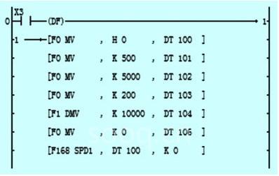 fp0系列各型号的plc的输出端y0或y1都具有脉冲输出功能,其输出脉冲的最大频率为10khz。具体输出脉冲频率可以用软件编程,y0或y1输出的脉冲经脉冲分配器把脉冲分配给步进电机的各相绕组,同时y0或y1接至pulse的输入接点;当达到顶定值时发生中断,使y0或y1的脉冲频率切换至下一参数。y2或y3是方向控制信号。vcc值为5v时,r短路;vcc值为12v时,r=1kq(≥1/8w);vcc值为24v时,r=2kq(≥1/8w)。图2是实现这一控制的梯形图。dt100~dt106是存放输出脉冲频率和个数的通用寄存器,梯形图中所给参数是输出脉冲初始频率为500hz,最高频率为5000hz,脉冲个数为10000。