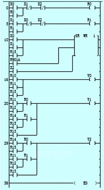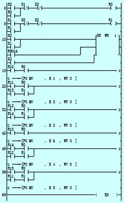梯形图如图5所示。该方案中,开关x0、x1作为正反转启动控制,k2作为停止。时钟仍然使用plc中的特殊内部继电器901a 0.1s脉冲继电器作为控制时钟。使用一个16位移位寄存器(继电器)wr1,产生正反转所需的六个节拍,用位移位寄存器(继电器)的触点r10-15和正反转控制继电器r0-r1的触点进行组合,并利用plc中的高级数据传输指令.把所需的控制字(见附表)直接输出到plc的输出端,使输出继电器y0、y1、y2按上述正反转的顺序通电。