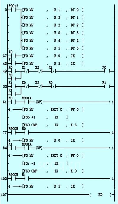 梯形图如图6所示。控制开关的作用和时钟仍然如方案二所述。在该方案中,利用r9013运行初期0n脉冲继电器,开机时把输出控制字送到plc的通用数据寄存器dt0~dt7中,根据正反转控制要求把plc中的检索寄存器ix(置初值(正转置0或反转置5)作为输出控制字的初始指针;利用[f0 mv ,ixdt0,