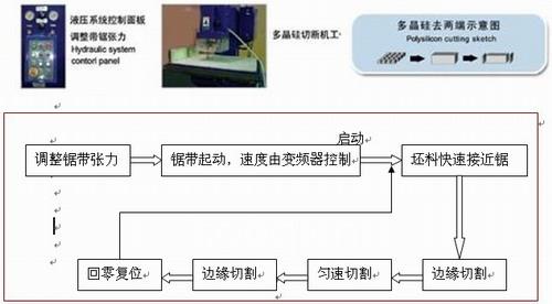 首先在工作台上用专用夹具装夹多晶硅坯料工件,然后调整好锯带张力,之后,启动锯带(锯带的速度由变频器控制),然后工作台会根据设好的工艺参数进行送料,首先工作台带动坯料快速靠近锯带,然后转为慢速进行边缘切割,速度慢,是由于多晶硅坯料表皮较硬,速度过快容易损坏锯带;切完表皮后,接着转为匀速正常切割,此过程要求送料速度极其稳定,这样,切出来的料表面平整度才好。切到最后,又转为边缘切割,直到把坯料切断,切断后,工作台快速返回原来的工作原点,等待操作人员将成品拿下,换上新坯料。