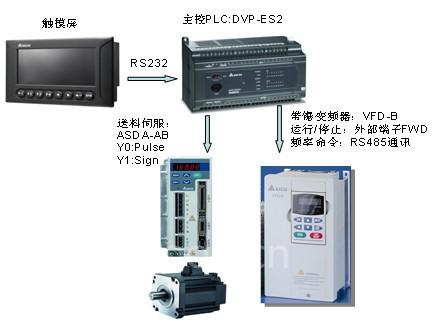 主控部分采用台达最新推出的ES2 PLC,该系列PLC是台达最新型小型PLC,具有2路100K脉冲频率输出功能,利用台达运动控制指令控制台达ASDA-AB伺服,配合伺服合适的电子齿轮比,可以达到很高的控制精度。另外, ES2 PLC具有3个独立通讯口,COM1为RS232, COM2,COM3为RS485界面,锯带变频器的频率就是ES2 PLC 利用其COM2口通讯给的,并且将锯带变频器当前的实时速度读回来,显示在屏上。