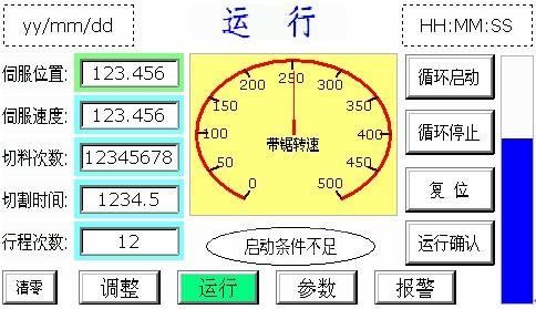 (3) 客户要求设备在参数设置后,能精确显示此坯料的加工时间,并在工作中,实时显示当前状态和切割进度,还要求显示锯带的实时转速。