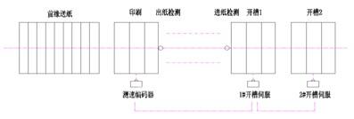 本台设备为全自动印刷开槽,即前缘送纸→自动印刷→印刷完毕后送出,信号1检测→伺服同步送纸→信号2检测→伺服定位到开槽点→开槽→返回前缘送纸印刷;整套设备使用台达DOPB07S415触摸屏4台、DVP48EH2主机2台、DVP32EH2主机2台、A2 7.5kW伺服2台、B系列7.5kW变频器4台、DOPB07触摸屏4台。本套设备可以同时完成两组开槽,每组共有8组刀,可以根据设定槽距自行计算調整刀具。设备正常运行可以达到120m/min,每分钟近40张的速度远远超出人工送纸开槽的速度。