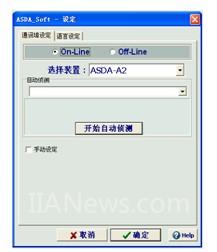 (1)软件版本ASDA_Soft V4.05.01,第一步使用USB连接线将计算机与伺服控制器相连,进行通讯设定,选择On-Line,本设备使用的400V A2系列伺服,侦测完毕后确定进入系统。