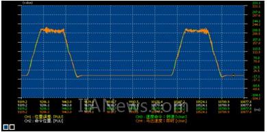通过PC软件监控马达的速度线,可以看出从动轴与主动轴的追随特性非常的好,即速度命令曲线与马达即时速度曲线处于完全重叠的状态,见下图8,重复定位精度达到1mm。