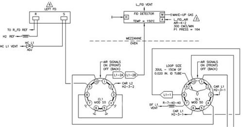 这台表的阀位图如图6所示,我们发现当CL1阀处于ON和OFF两个状态时待分析样品分别流经以下两个通道: