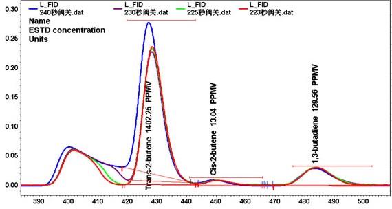 通过仔细观察叠加的色谱图我们发现,在出峰周期的第420秒附近,当CL1_OFF时间设定为240秒时,残余的1-Butene与Tra-2-butene这两个组分没有完全分离,谱图上出现重叠(如图5中谱图1所示),这样就增大了在计算Tra-2-butene峰面积时的误差,并且影响色谱出峰的再现性。当我们把CL1_OFF时间逐渐进行调整,随着CL1_OFF时间的前移,残余的1-Butene组分与Tra-2-butene的分离效果越来越好,在第223秒CL1_OFF时,这两个组分已经能够实现完全分离(如图5中谱图2所示),这样不仅能够准确计算Tra-2-butene的出峰面积,而且保证了色谱分析的再现性。