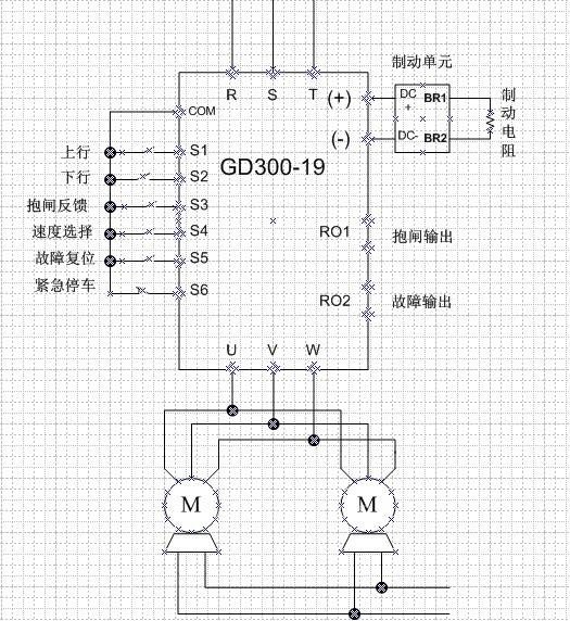此套系统使用时,电机主回路部分由GD300-19变频器驱动,运行速度有两段速,一组继电器输出抱闸信号,来控制电机的抱闸打开与闭合。
