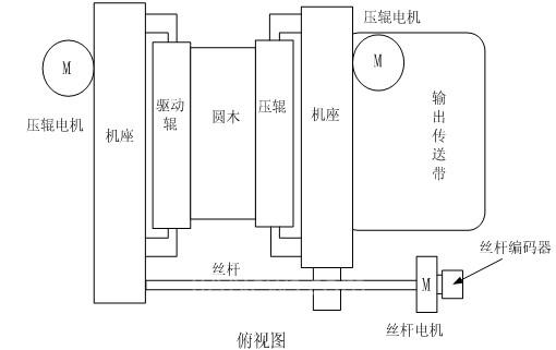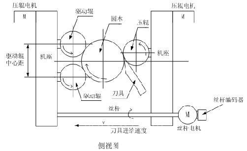 2、压辊电机启动后,经过丝杆电机启动延时时间,丝杆电机启动,如按下快进开关则按快进速度进刀,否则按圆木实际直径计算速度进刀,当旋切碰到前行程开关(圆点复位开关)时,压辊电机立即停止,同时丝杆电机按设定的快退速度退刀至退刀截止位置或退刀转换进刀位移,再进刀,依次循环。退刀过程中,当压辊电机停止时间大于压辊电机再启动时间时,压辊电机再启动。