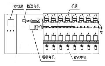 本方案介绍的高速倍捻机为单锭设计,最高锭速达到15000r/min。每锭单独由一台高速异步电机控制,都能单独控制启停。超喂罗拉由一台异步电机控制,称其为超喂电机。捻丝筒子由一台异步电机控制,称为线速电机。在每一锭中,捻丝筒子在机器运行时可以通过机械装置投入工作和分离工作。