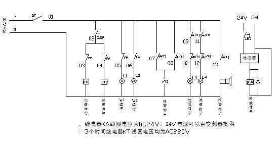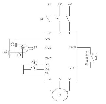 如以上图一图二所示, SB1-SB3为控制箱面板三个转换按钮,分别控制变频器的启动,加减速的投入启动及传感器的启动。KT1-KT3分别控制UP/DW端子投入时间及报警的时间,正常运行设置中,第二速度比第一速度高。两段速度的设定值在控制箱的面板上由两块10V指示表分别显示。