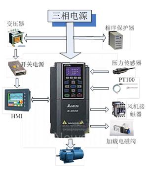一般工厂内的空压机使用率平均只有50%~70%,且压缩空气需求变化大,利用变频器作PID恒压控制是目前最佳控制方法。应用台达C2000系列进行恒压供气,通过压力变送器采集实际压力P送给PID智能调速器,与压力设定值P0作比较,并根据差值的大小按既定的PID控制模式进行运算,产生控制信号送变频调速器VVVF,通过变频器控制电机的工作频率与转速,从而使实际压力P始终接近设定压力P0。 同时,该方案可增加工频与变频切换功能,并保留原有的控制和保护系统,另外,采用该方案后,空压机电机从静止到旋转工作可由变频器来启动,实现了软启动,避免启动冲击电流和启动给空压机带来的机械冲击。同时,台达C2000系列内建PLC,可成功为客户降低成本,提升竞争力。