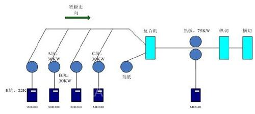 五层纸生产线主要有坑机、复合机、热板、纵切机、横切机组成。坑机用来将原纸制造出波浪,根据波浪的疏密程度可分为A、B、C、E四种。波浪是由电动机带动浪辊在固定的有槽的钢板上将纸挤压形成的。坑机电动机的功率一般在22KW和30KW。复合机用于将生产出来的浪纸和芯纸再加两层面纸复合在一起,这样就生成了五层纸板。在通过热板干燥,纵切机切边和压痕,然后由横切机进行剪裁。本次改造主要是4台坑机和热板的变频改造,以获得优良的调速效果和节能效果。