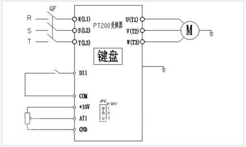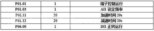 利用欧科传动PT200系列变频器多功能输入端子DI2控制启停,合理设置转矩提升量,再加上欧科变频器的逐波限流功能和电流限幅功能,提高了运行的可靠性和稳定性,AI1外接电位器调速,不同的加工件采用不同的速度,产品适应性广,完全满足用户需求。