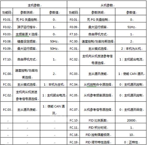 若主机和从机是柔性连接,则从机采用速度控制,主机将自身运行频率和输出电流传送给从机,从机将接收到的频率作为自身的设定频率,同时将自身的输出电流与主机发送过来的输出电流做PI调节,从机在跟随主机频率的同时,根据主从之间负载的差别进行微调,从而实现速度同步和功率均衡。若主机和从机是刚性连接,则从机采用转矩控制,主机将自身运行频率和输出转矩传送给从机,从机将接收到的转矩作为自身的设定转矩,将接收到的频率作为自身的输出频率,从而控制两台电机功率均衡。