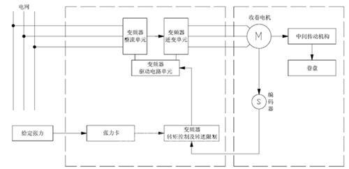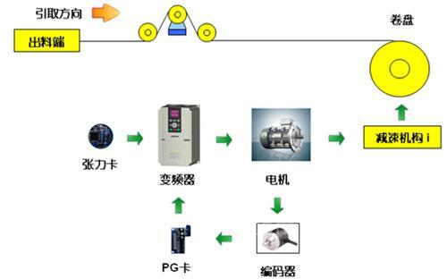 如下图1所示,收卷的恒张力控制,是按照工艺将系统收卷所需的张力及空、满盘卷径设置到张力卡,张力卡根据运行线速度,计算出当前卷径,进而得到收卷所需的转矩并将其给到变频器,再由变频器进行转矩控制。在收卷过程中,系统可自动实时计算当前的卷径,以保证收卷张力的恒定。同时系统张力锥度的设置可使材料较好的卷曲成型。