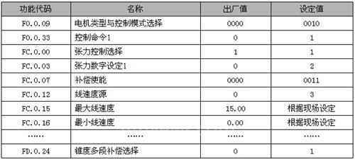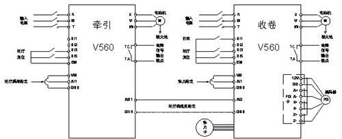 收卷变频器采用闭环矢量模式,通过模拟电位器给定张力(收卷变频器的模拟输入端AI1),线速度由牵引变频器的AO1模拟输出端接入收卷变频器的AI2(4~20mA)。