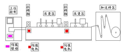软包装制袋机主要由加送料机构、压烫机构、拉料机构(2个拉料轴)、上位控制系统构成,其中拉料机构(2个拉料轴)由伺服控制。