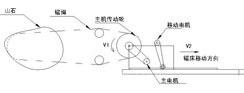 金刚石绳锯机是采用主电机带动锯绳沿近似跑道型的轨迹运行,锯绳套在已经凿开缝的石头山上,移动电机经减速器带动整个锯床以一定的速度沿石头被锯开的方向向后移动。移动速度必须根据主电机的负荷状况和锯绳所需的张紧力适时进行调整,如果移动速度太快,主电机负载增大,甚至过载,锯绳承受的张力也会增大,如不及时调整速度就会绷断锯绳。反之如果移动速度太慢,锯绳张力太小,锯绳会在石头上打滑,切割效率降低,并且松驰的锯绳还会打绞,以至绞断锯绳。所以在保证主电机负荷基本均匀和锯绳合适的张紧力下提高锯机切割效率是控制的关键,由于矿山形状的不规则性,横切面自然也时大时小,锯床移动速度必须相应调整,整个加工工艺如图2。