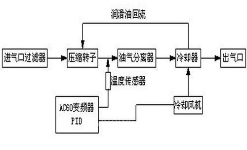 传统空压机的散热风机的起停与排气温度相关,当排气温度高于“风机开机温度”时启动风机,当排气温度低于“风机停 机温度”时停止风机。始终保持润滑油温在一定范围波动。当风机开启后即全速工作,使排气温度迅速降低;达到风机停 止工作温度时,风机完全停止,排气温度又会迅速上升。该方法使温度始终处在波动状态,影响空压机的出气质量和润滑 油寿命。同时因风机电机频繁起停,会影响风机电机寿命,大的启动冲击电流还会带来额外电能消耗和设备磨损。