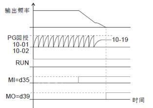 在FOCPG模式下,预先设置一个位置(参数10-19),定义一个MI点为单点定位功能(d35),并且定义一个MO点为位置到达(d39),在变频器运行过程中触发这一MI点,变频器便开始执行单点定位,最终在指定点停下来,同时触发MO点为ON。