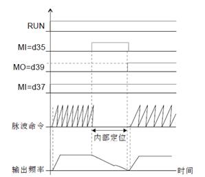 FOCPG模式下,定义一个MI点为脉冲跟随功能(d37)并定义一个MO点为位置到达(d39),从接收到脉冲指令后,变频器开始加速至脉冲频率,脉冲发完后,变频器开始减速,并继续走完未走完的脉冲数直到停止下来,然后触动MO点为ON。