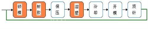 塑料注射成型是利用三种状态(固态-液态-固态),借助于注塑机和模具成型出所需要的塑料制品。尽管所有的注塑机不尽相同,但注塑机的工作流程基本是相同。如图一所示,大致可分为七道工序:锁模、射胶、保压、溶塑、冷却、开模、顶针(顶针进、顶针退、射座退)等。每一动作的完成都有时间、压力、速度、位置等几个参数的精妙配合,也就是说在某一位置的位移都有相应的压力和速度,且在不同的位置和时间内其压力和速度都是可变的。同时每一动作完成后发出终止信号传送给程序控制器,程序控制器收到信号后才发出执行下一动作的指令。每一道工序都需要用不同的工作压力和流量,除了高压锁模、射胶及溶塑动作需要较大压力外,其它工序都工作在很小压力下,其压力和流量是靠压力比例阀和流量比例阀来调节,通过调节压力比例阀和流量比例阀的开启度来控制压力和流量大小。