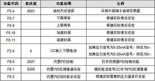 ① 由改造前后图中可以看出,压力传感器信号不仅接入控制器,还串接入变频器的CC和GND端(变频器的电流模拟量信号输入端),这样可使压力信号不影响原有控制器的显示,也将压力信号反馈给变频器,作为变频器PID控制的反馈信号;