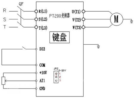 为了解决该工况的特殊要求,我司为客户选用PT200系列大功率恒转矩负载变频器利用微机输出0—10V的信号到变频器的端子来调节频率,控制风机的转速。用面板来控制变频器的启动和停止。