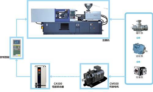 四方注塑机同步伺服油泵系统方案,以CA500系列重载型伺服驱动器为控制平台,搭配电液注塑伺服专用适配卡和旋变适配卡,与CM500同步电机组成伺服闭环控制系统。