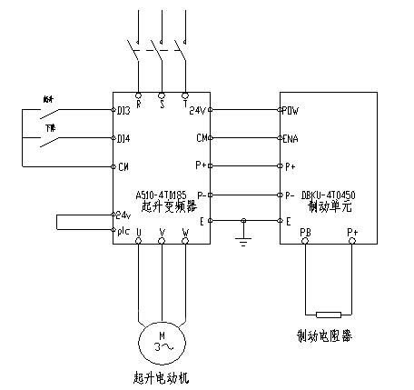 主钩为13KW的锥形电机,将采用A510-4T0185的SVC控制,制动电阻为30欧姆6kw。由于锥形电机特殊的结构原理,电机一端是输出轴,另一端是由弹簧连接的刹车盘,电机在运行是由输入电压把弹簧弹出从而推动刹车盘伸出。电机在停机时定子无电压输入弹簧没有磁场的作用下弹回带动刹车盘回原位,刹车盘与电机外壳接触磨擦产生制动使电机瞬间停机。根据电机这一特性改用变频器控制时必需考虑以下几个方面问题 :