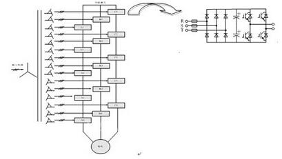 功率单元结构为交-直-交方式,每个功率单元主要由输入熔断器、三相全桥整流器、电容器组、IGBT逆变桥、直流母线和旁通回路构成,同时还包括控制驱动电路。每个单元为三相输入,单相输出的脉宽调制型变频器。其输出的电压状态为1、0、-1,每相五个单元叠加就可以产生11种不同的电压等级。