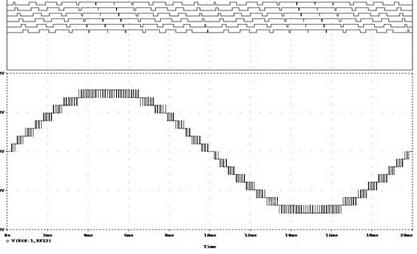 将每相N个功率单元输出的PWM电压波形进行叠加,产生出2N+1个电压阶梯的多重化相电压波形,5个功率单元输出的PWM波形及叠加之后的相电压波形如图所示: