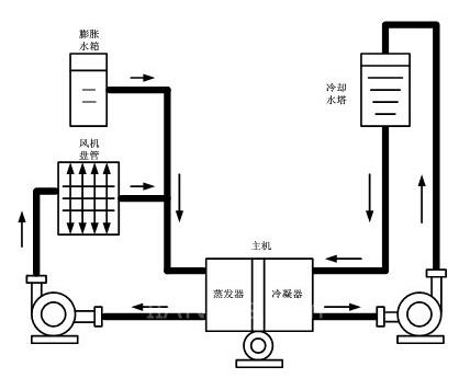 图1所示为一典型中央空调机组系统图,主要由冷冻水循环系统、冷却水循环系统及主机三部分组成: