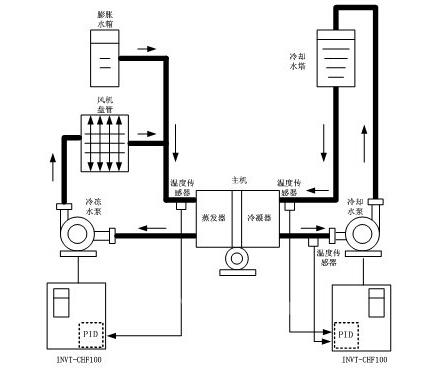 分别在主机蒸发器回水处、冷凝器出水及回水处安装温度传感器,实时检测管网的温度,以模拟信号(0~10V或者4~20mA)反馈给变频器,通过变频器内置的PID运算输出相应的频率指令后自动调节水泵转速,从而调节各循环水的热交换速度,最终实现对室内恒温度的控制。需要特别说明的是,变频器内部在设计上集成了温差反馈处理功能,系统无须另配专用控制模块。