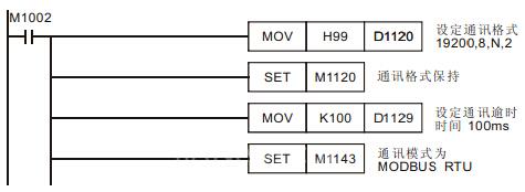 台达VFD-370F变频器使用的RS485通讯协议为Modbus-RTU模式,物理层为两线制RS485,同时台达DVP16ES200T这款PLC可以选择Modbus-RTU协议,PLC协议的选择需要在程序的开始进行配置。图2为PLC与VFD通讯格式初始化程序。