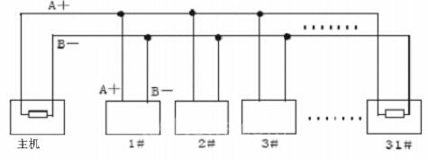 在本系统中,多机联机采用菊花链式连接方式(如图3所示),在两头各接上120Ω终端电阻。