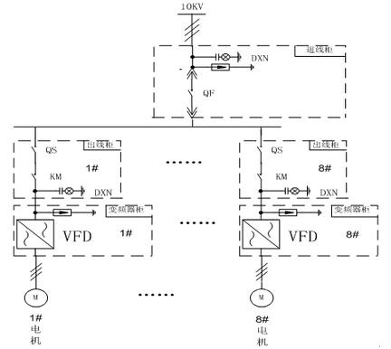 为了提高整个水压机系统的安全可靠运行性,保证系统的不间断运行。1#~8#三级柱塞往复泵既互为备用,同时也要有独立性(方便分别检修)。交流变频器调速系统采用一拖一(不带工频旁路)方案图,通过高压水罐内的压力变送器反馈,由后台DCS系统实现闭环控制。