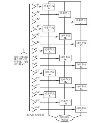 目前,因为功率器件耐压的限制,高压变频器没有像低压变频器一样,有统一的拓扑结构。目前,市场上主流的高压变频器多采用单元串联多电平的拓扑结构,系统结构如图2所示: