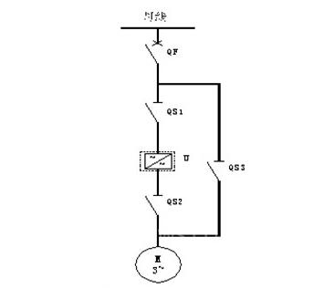 通过咨询和现场分析,决定采用一拖一手动旁路方案:主回路由负荷开关QF、3个高压隔离开关QS1、QS2和QS3及高压变频器组成(如图3)。其中要求QS2和QS3不能同时闭合,在机械上实现互锁。高压隔离开关QS1、QS2、SQ3加装电磁锁,电磁锁的操作电源使用QF的辅助触点闭锁。只有当QF断开时,QS1、QS2、SQ3的电磁锁才能得电,可以正常操作。在变频运行时,QS1和QS2闭合,QS3断开,变频器得电启动后,电机处于变频运行状态;工频运行时,QS3闭合,QS1和QS2断开,QF闭合后,电机实现工频直接启动,恢复改造前的运行状态。
