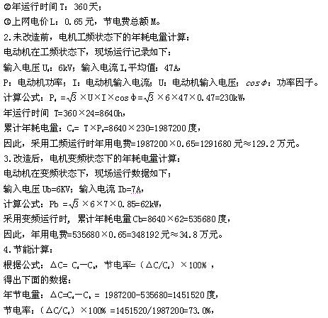 (2)压缩机出入口压力差降低了很多。以前压差5公斤,设备啸叫严重,能达到120分贝;改变频后压差为0.8公斤,噪音仅为75分贝左右。从而减轻了起动机械转矩对电机机械损伤,降低了噪音,有效的延长了电机的使用寿命,相应地延长了许多零部件的寿命;同时极大的减轻了对管道的冲击,有效延长了管道的检修周期,减少了检修维护开支,节约大量维护费用。