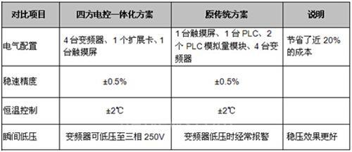 该方案采用4台变频器、1个扩展卡、1台触摸屏即可实现原有系统的功能。方案系统结构清晰,布线更为简单,电控系统成本也节省近20%。