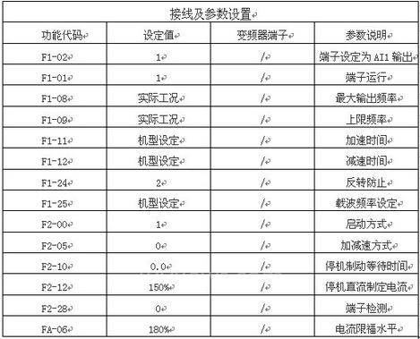 在大圆机运转中,绝对不能让电机反转以及回转现象,否则针床的针将被折弯甚至断针。有些大圆机接入单向轴承,可不予考虑。要是系统正反转完全取决于电机的正反转控制,则需要设置合理的参数,一方面要设置禁止反转功能,另外一方面需要直流制动功能。还要注意不能出现失速现象,以免造成断针等损失。本方案采用模拟量输入给定频率。线路简单(省略)大圆机要求起动时响应要快,低频大转矩输出;停机时要光滑、柔和一些,以保护针床。因此合理设置上表参数是充分发挥圆机性能的保证,原则是通过调解F1-13参数得到最佳的低频转矩输出能力以及降低圆机高速运行的振动,通过调起停控制(F2组)以及加减速度时间参数(F1组)得到频率调节的光滑性。