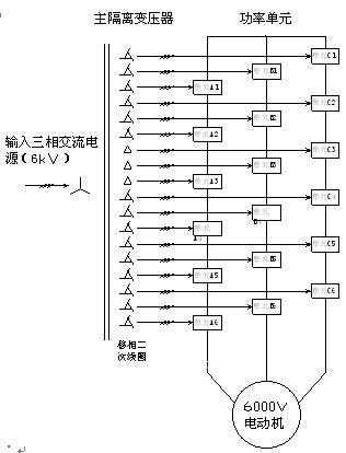 隔离变压器为三相干式整流变压器,风水冷。变压器原边输入可为任意电压,Y接;副边绕组数量依变频器电压等级及结构而定,6kV系列为18个,延边三角形接法,为每个功率单元提供三相电源输入。为了最大限度抑制输入侧谐波含量,同一相的副边绕组通过延边三角形接法移相,绕组间的相位差由下式计算:移相角度 = 60°/ 每相单元数量