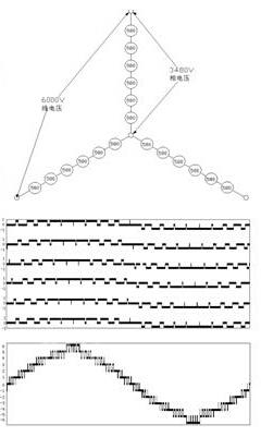 右图为六个690VAC功率单元串联时,每个功率单元输出的电压波形及其串联后输出的相电压波形示意图,可以得到6~0~-6共13个不同的电压等级。增加电压等级的同时,每个等级的电压值大为降低,从而减小了dv/dt对电机绝缘的破坏,并大大削弱了输出电压的谐波含量。