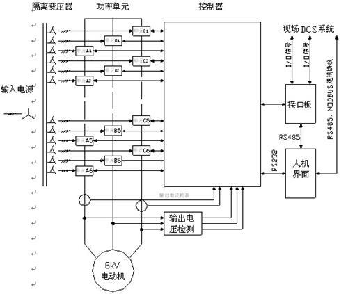 根据技术参数,选用HIVERT-Y6/1200高压变频装置,额定输出电流为1200A,适配电机功率为10000kW。由手车断路器式自动旁路柜、启动柜、主变压器柜、功率单元柜、控制柜、水循环系统、接线柜等几部分组成。