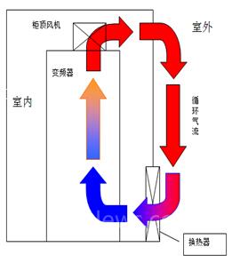 风路循环为:冷却变频器后的热空气由风机从柜顶导出,通过风道循环至换热器,换热器中通有冷却水,从而使空气得以冷却降温,冷却降温后的空气再次进入变频器对变频器进行冷却,如此进行循环冷却。
