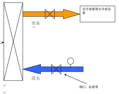 水路循环为:温度较低的冷却水由换热器下部进入换热器,与循环空气换热后,由换热器上部流出。被加热后的冷却水流至冷却塔等冷却设备进行冷却,经冷却降温的冷却水经水泵再次进入换热器对循环空气进行冷却,如此循环。