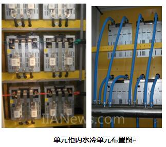 功率单元采用水冷设计,安装在导轨上,由两个M8的螺钉与导轨固定。单元柜后侧为水循环管路(如上图(右)所示),把功率单元内产生的热量带到水-水热交换器,由外水循环系统将内水热量带走。柜门内侧装有行程开关,用于柜门连锁,柜门打开时将发出告警。